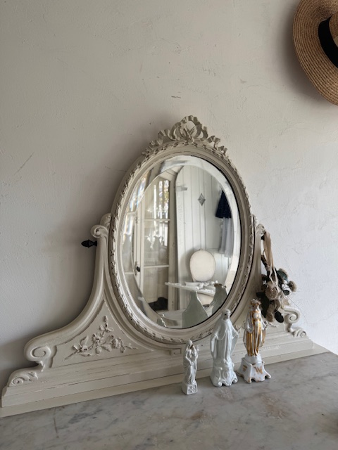ミラーは当時の面取りが施されたオリジナルのガラスで、小さな腐食跡が見られますが、アンティーク特有の味わいとなっています。