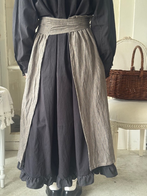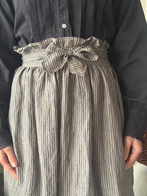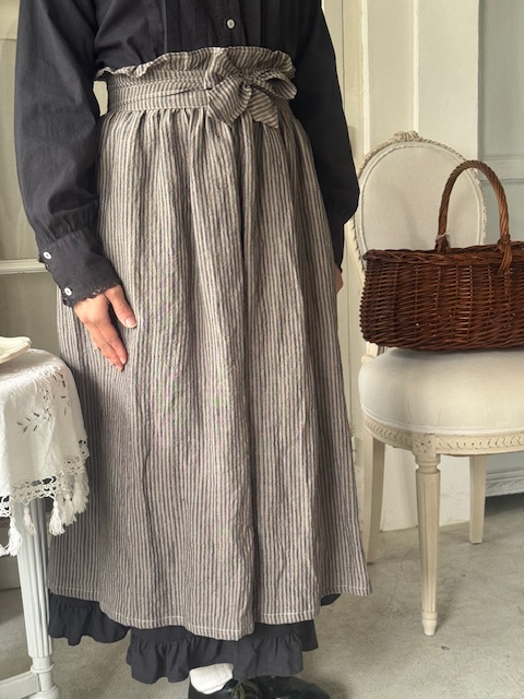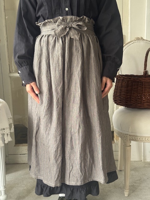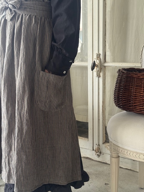 大変軽やかなベルギーリネンを使用した、上品なストライプ柄のエプロンです。
