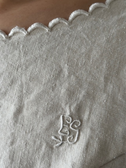 また胸元には丁寧に施されたイニシャル刺繍が入りアンティークならではの特別感を感じていただけます。