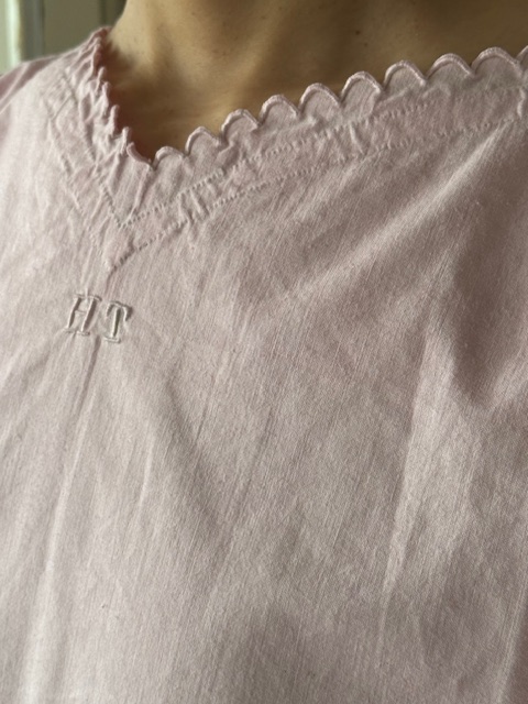 胸元には当時の持ち主の面影を残す手刺繍のイニシャルがさりげなく刻まれています。