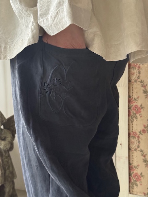 後ろには大きめのポケットが2つ付いておりそのうち一方には当時の手仕事による立体的な美しいイニシャル刺繍が施されています。