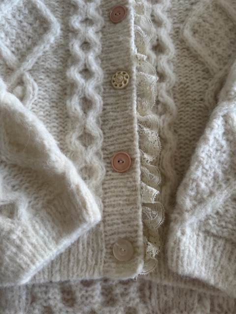 前立て部分には、ガラス・貝・ミルク・樹脂などのアンティークボタンを一点ずつ組み合わせて使用。