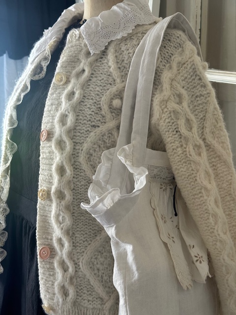 首もとにはスカラップ刺繍のレースを手刺繍で丁寧にあしらい、胸下には*アンティークエクリュフリルレースで優しい印象です。