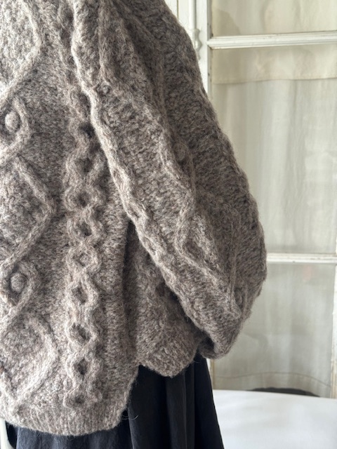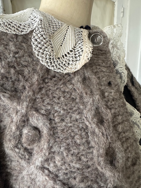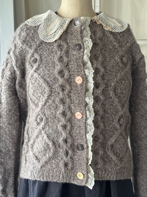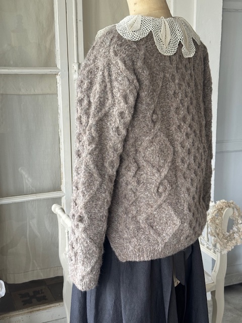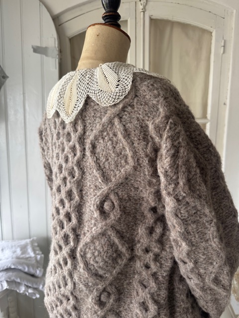 今回のセーターには、手編みならではの立体感が美しいアンティーク襟が付いており、