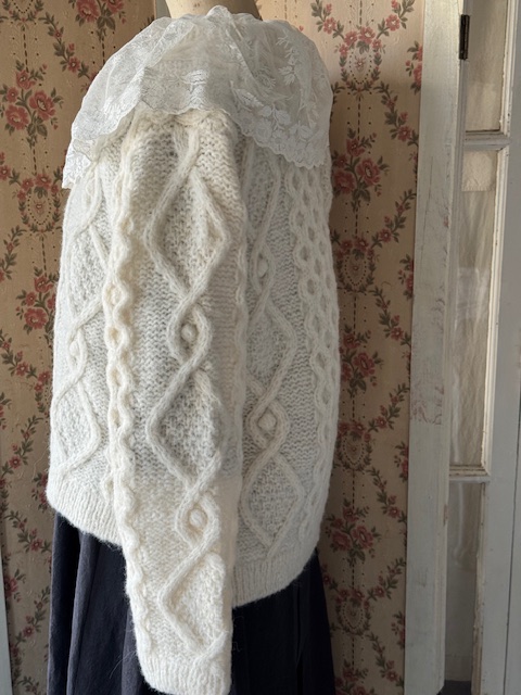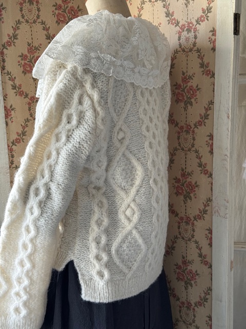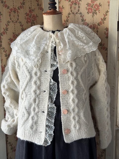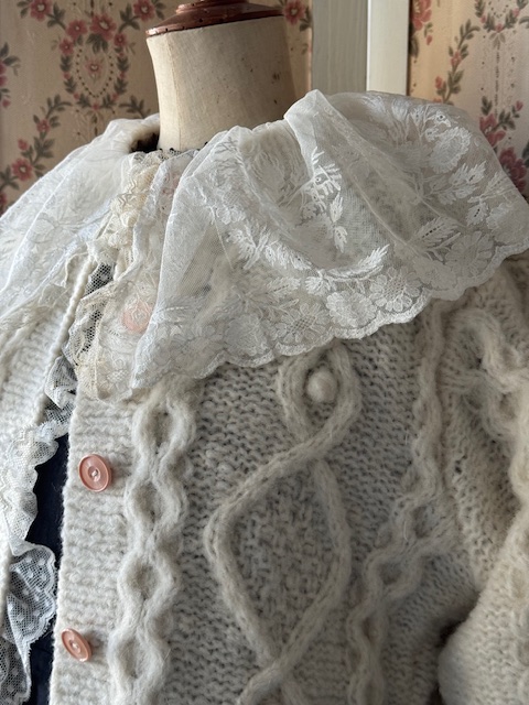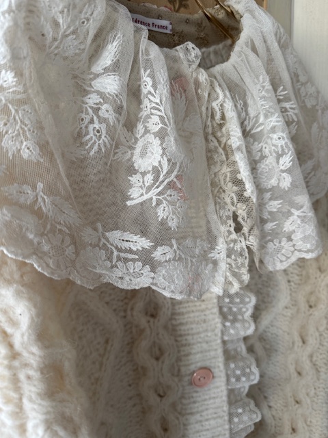 胸元から前立てにかけては可愛らしいドット模様のチュールレースがあしらわれ、さらに襟元には大変貴重で豪華なアンティークレースがたっぷりと贅沢に重ねられています。