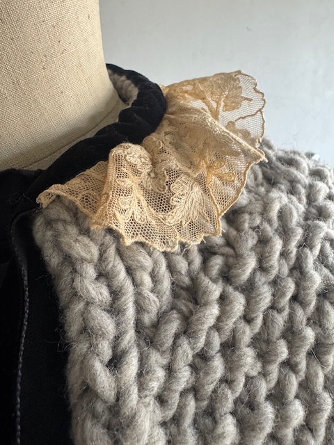 襟元にはアンティークの美しいレースをあしらった繊細なハンドメイドの衿が付いてます。大人のクラシカルで優しい印象の中に、どこか品のある存在感を放つ1着です。