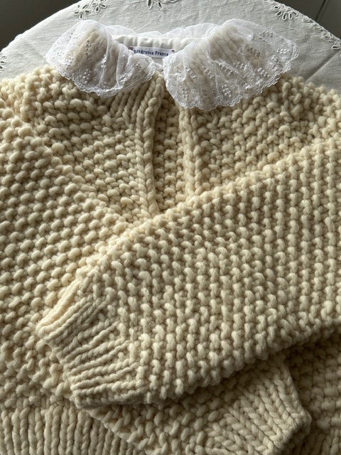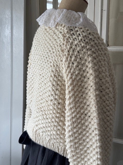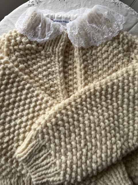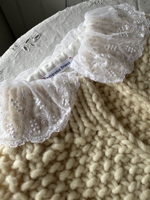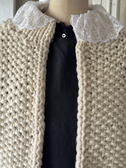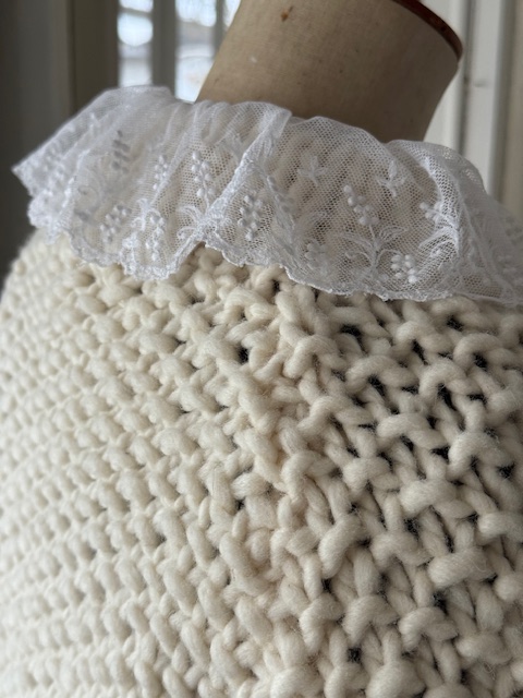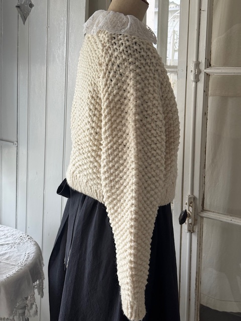 手編みの風合いとアンティークレースの優しい透け感が重なり、冬の柔らかな光の中でまるで“冬の妖精”や“冬の天使”のような雰囲気を纏う1着です。