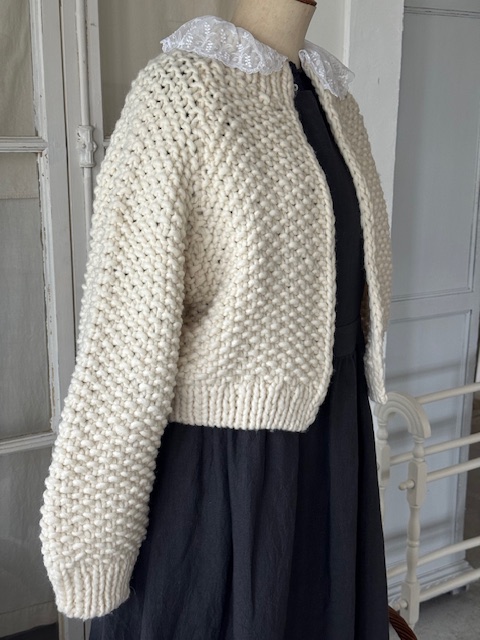 ふっくらとした温もりを感じる、ウール100%の糸で丁寧に手編みされたカーディガンです。