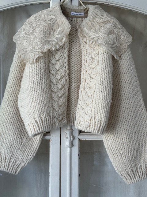 1900年代初頭のフランスアンティークのため息が出るほど美しいアイボリーレースを襟元に贅沢にあしらった特別な手編みショートカーディガンです。