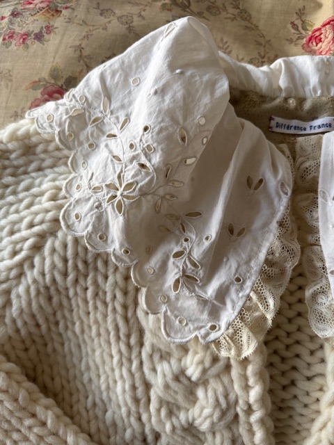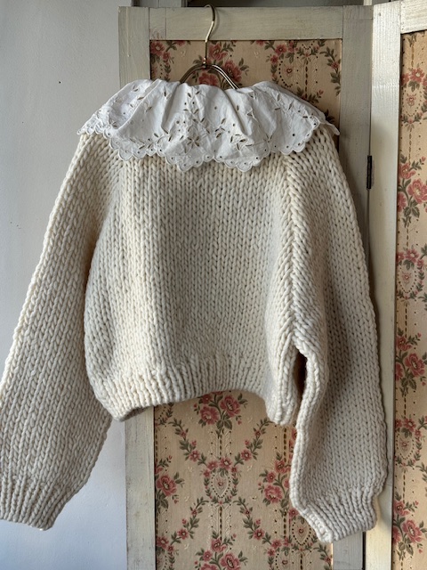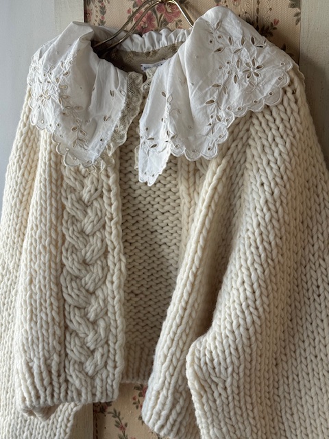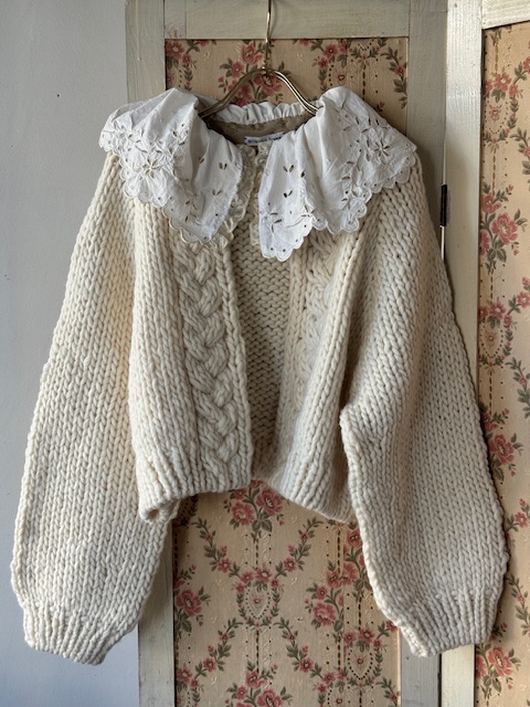 ウール 手編みニットカーディガン(オフホワイト/アンティークレース襟付き)