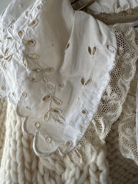 首元には1900年初頭の大変美しいフランスアンティークリネンのフリル襟があしらわれておりこちらは取り外し不可となりますが、全体のデザインと一体となった特別感のあるポイントです。