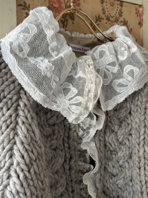 襟元には1900年初頭のフランスアンティークのリボンモチーフのチュールレースを贅沢にあしらい前立ての両サイドにも繊細で豪華なレースが施されています。