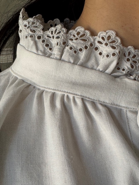 首元には当時の手仕事の立体的なカットワークと繊細な手刺繍が施され細やかな針運びが静かに美しさを伝えてくれます。