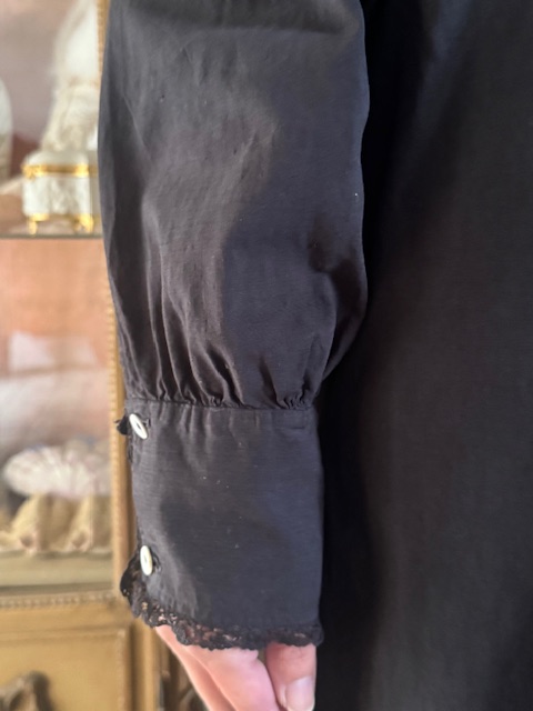 フロントには3つのボタンがあり、襟元はシンプルながら、繊細なレースがあしらわれており、袖口にも同じく2つのボタンとレースのトリミングが施されています。