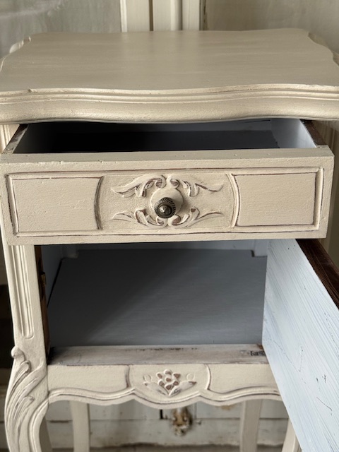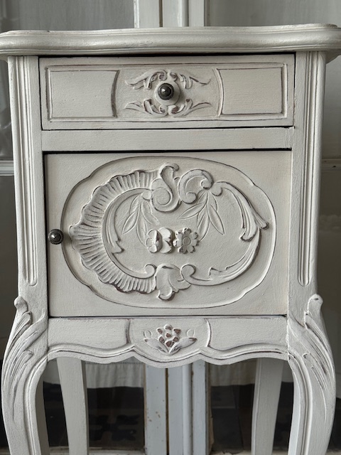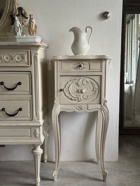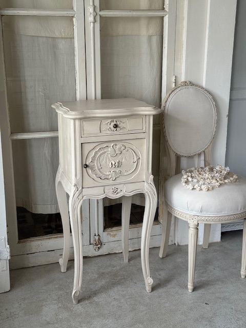 1900年初頭のフランスアンティーク、優雅な曲線と繊細な彫刻装飾が美しい木製のナイトテーブルです。