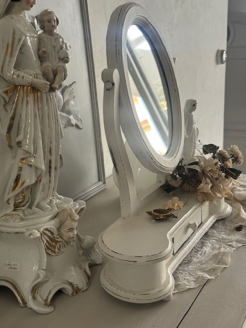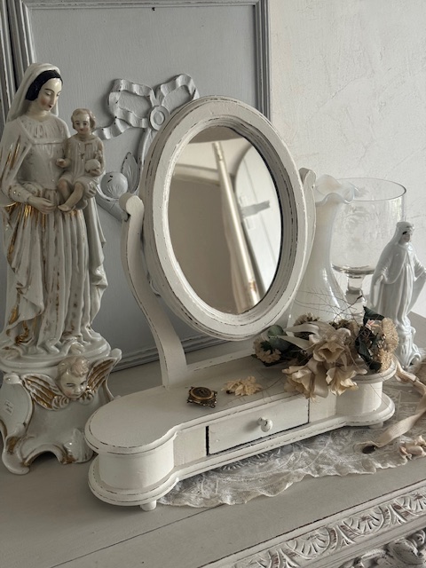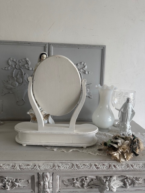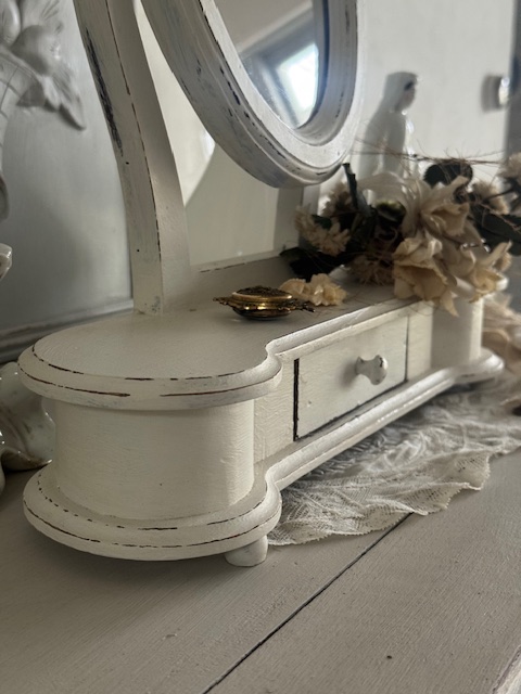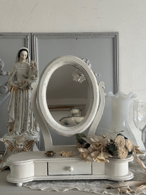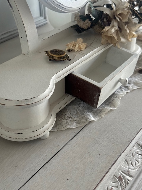 台部分には櫛やリップ、小物を置くこともでき、ミニドレッサーのような感覚で日常の中に可愛らしい実用性を添えてくれます。