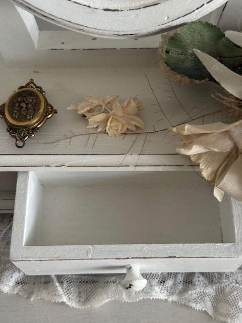 台座部分には小さな引き出しが1つ付いており、指輪や小さなアクセサリー、思い出の品などをそっと収めておくのにぴったりです。