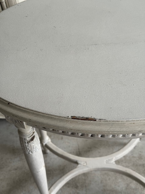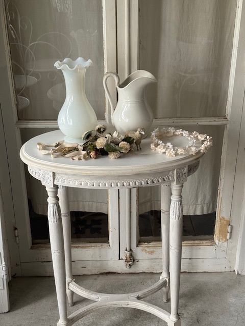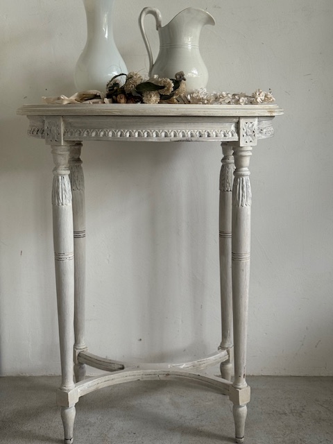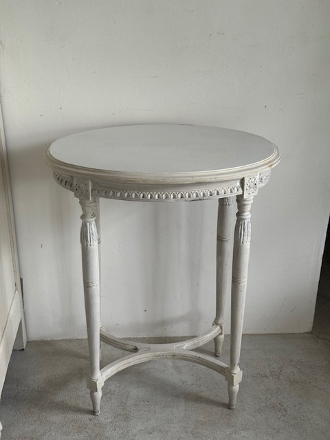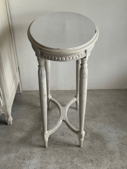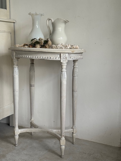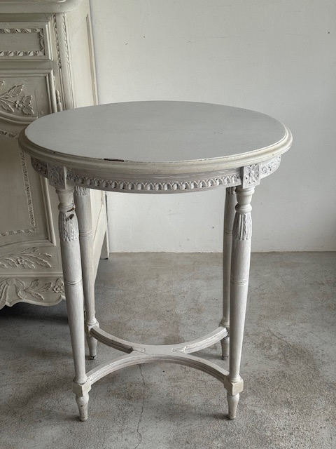 柔らかなラインの脚には花や葉をモチーフにした美しい彫刻が施されており、フレンチアンティークらしい優雅な雰囲気を纏っています。