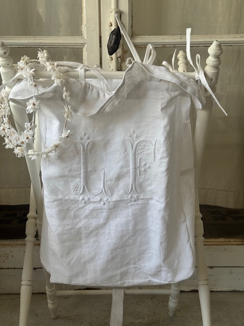 中央には立体的なイニシャル手刺繍が施され向かって右側には小花やドットが連なるスカラップの手仕事が残されたとても繊細で優雅なお品です。