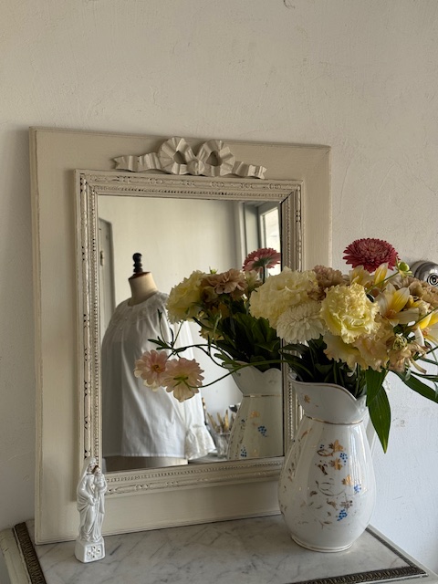 ミラー部分は現行品に張り替え済みのためアンティークの雰囲気を保ちつつ日常使いにも安心してお使いいただけます。