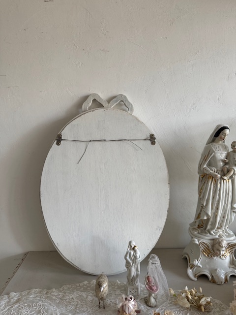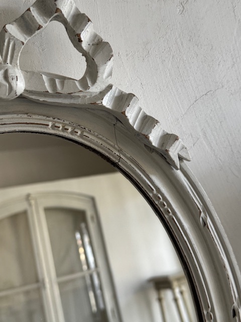 1900年初頭のフランスアンティーク木製フレームに繊細な木彫り装飾が施されたリボンモチーフのミラーです。