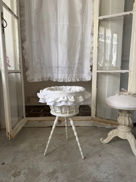 当時は裁縫用のトラバイユーズとして、毛糸や布、仕掛かりの手仕事などを収納しながら使われていた実用的なお品です。
