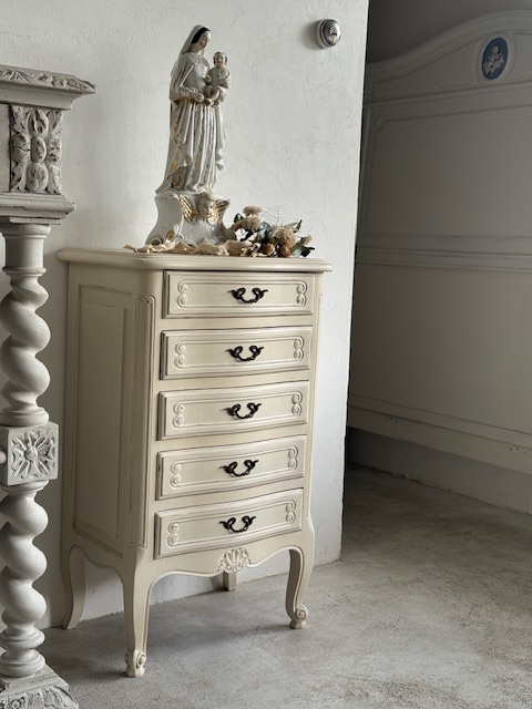 側面には繊細な彫刻装飾が入り、脚元には美しい曲線を描くクラシカルなデザイン。