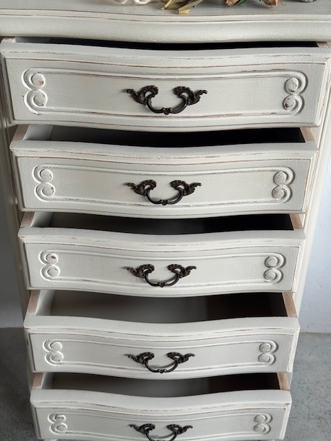 引き出しが5つ付いており、横から見ると組木細工による丁寧な職人技が見られます。