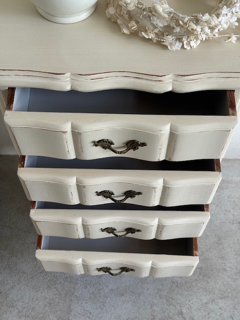 組木細工によるしっかりとした引き出し構造で、真鍮の取っ手には繊細な装飾があしらわれています。