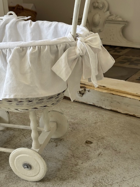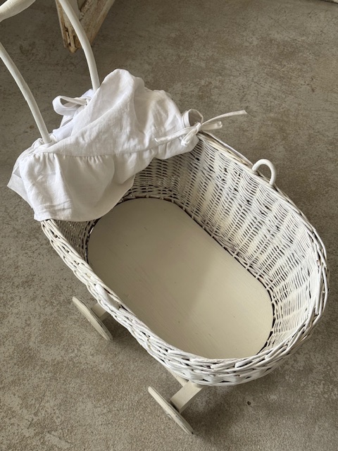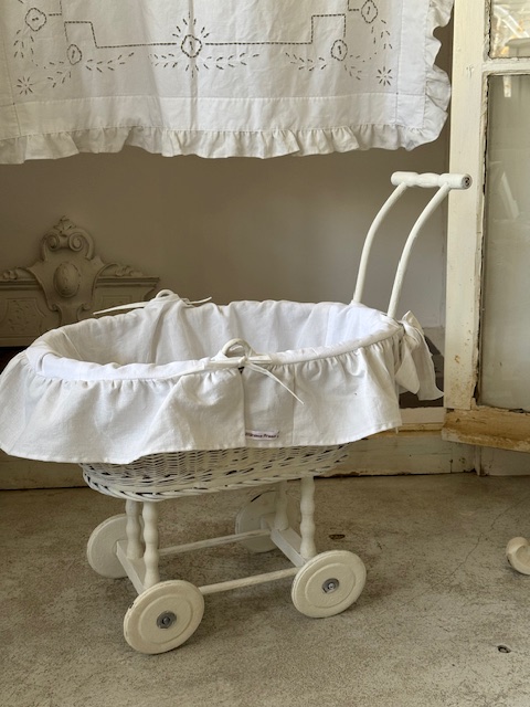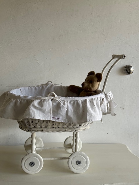1930年代のフランスアンティーク、ラタン製のドール用押し車。