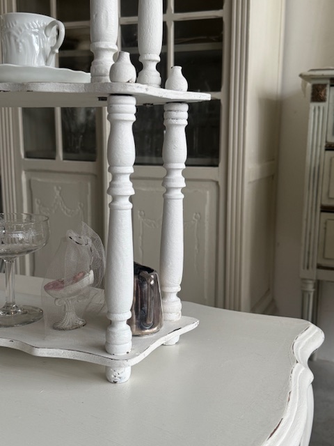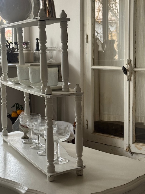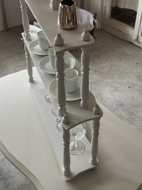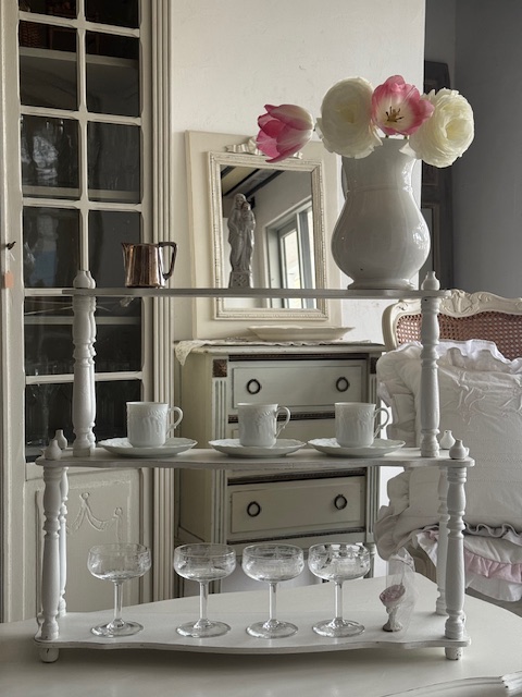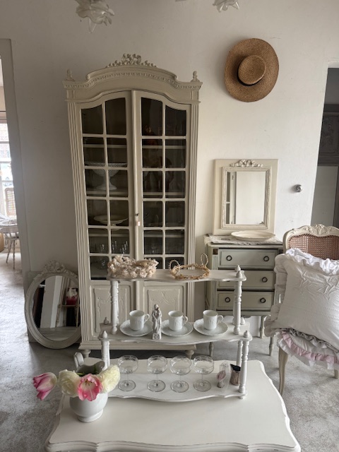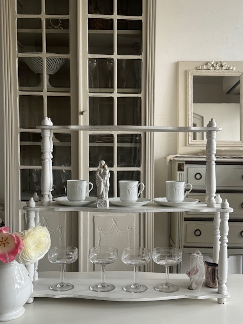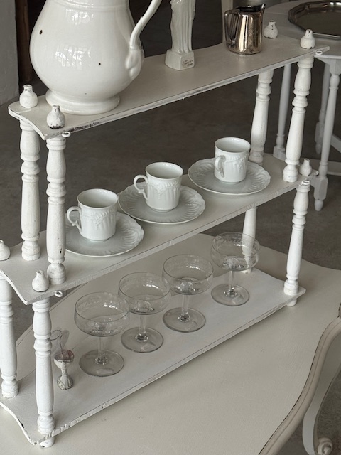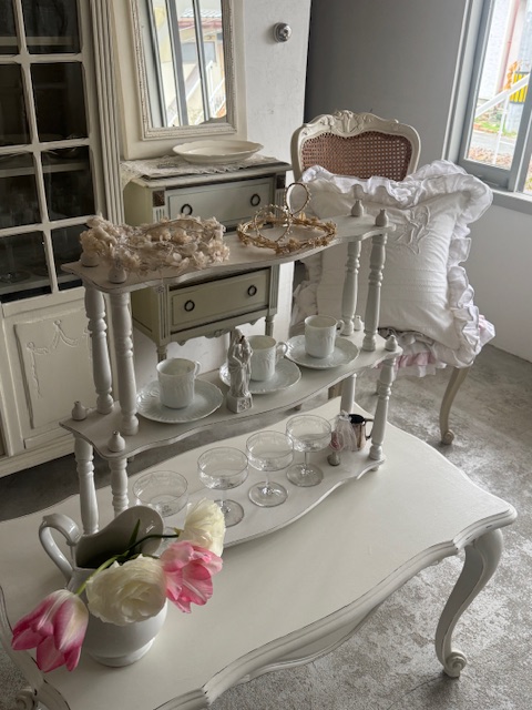 カップやグラス、オブジェ、レース小物などを重ねるように飾ることでフランスらしい優雅な空気感を演出していただけます。