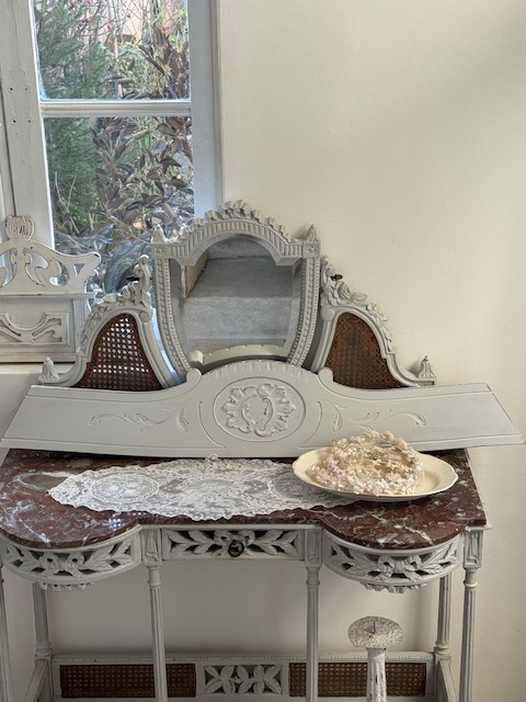 お色味はやさしいパールグレー。ホワイト系の壁にも自然に溶け込みフレンチ・シャビー・ロマンティックな空間に相性の良いお品です。