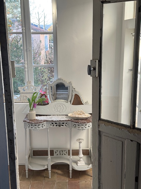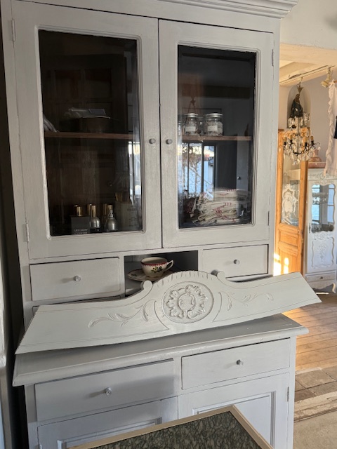 お色味はやさしいパールグレー。ホワイト系の壁にも自然に溶け込みフレンチ・シャビー・ロマンティックな空間に相性の良いお品です。