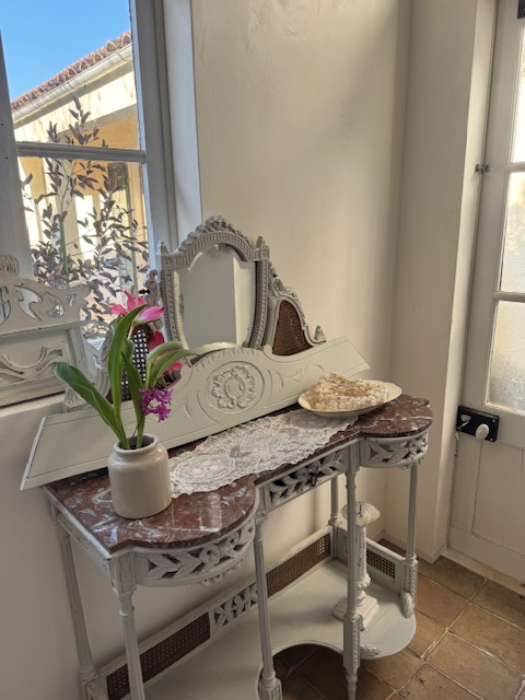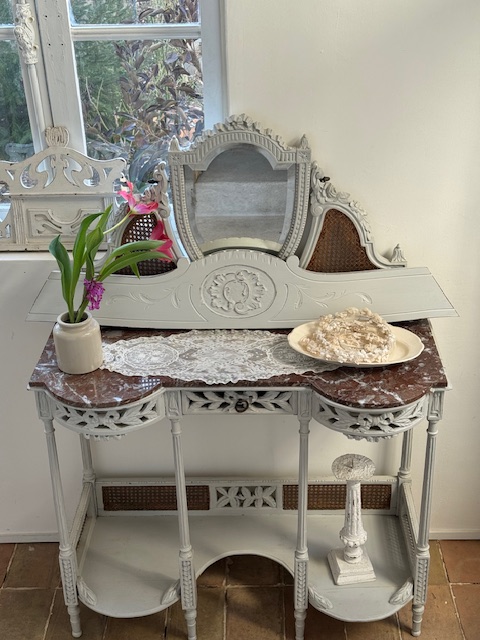 ロカイユ調の手彫り装飾が丁寧に施されており曲線の美しさや陰影がアンティークならではの奥行きを感じさせてくれます。