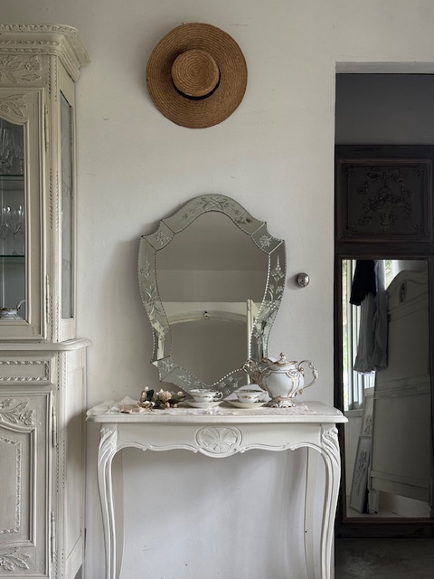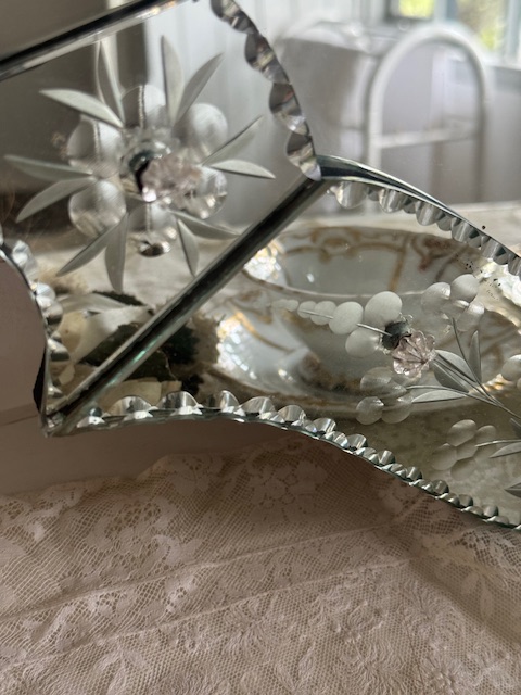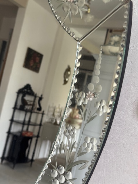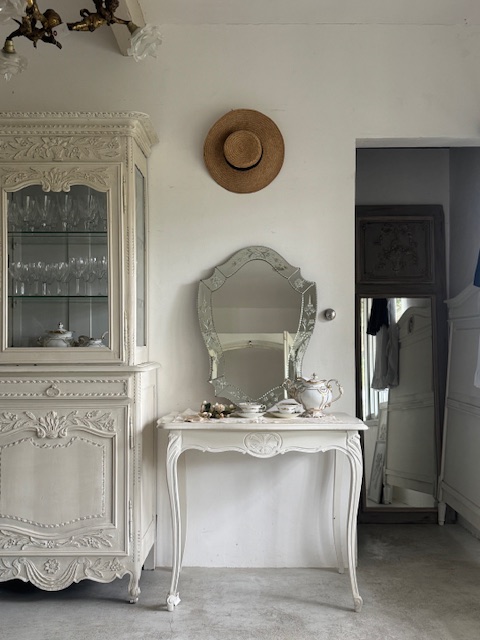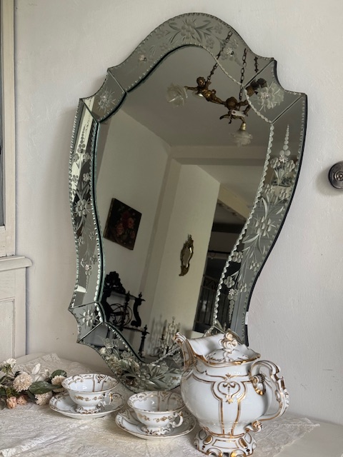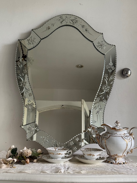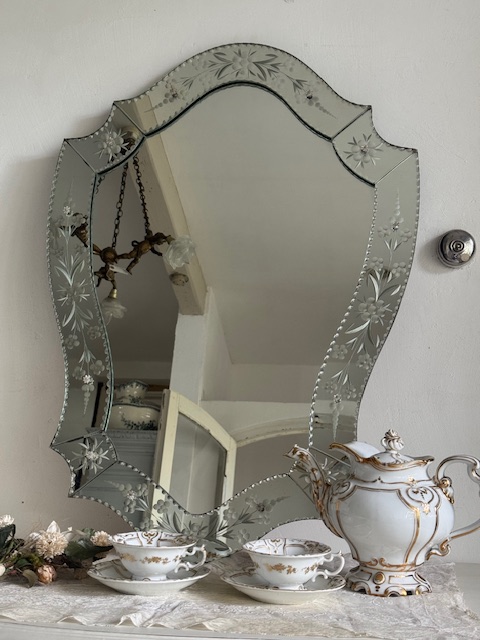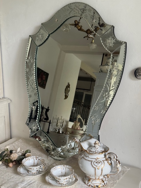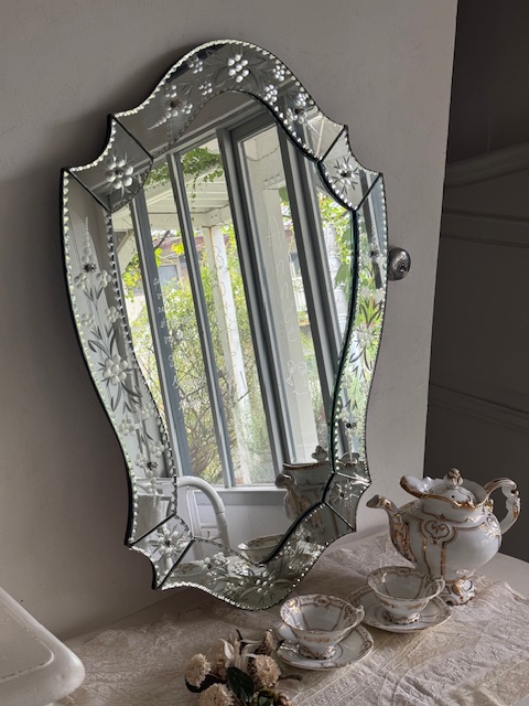 縁全体にはフローラルモチーフの装飾が施され、アンティークならではの美しい面取り加工が鏡全体を一層華やかに引き立てています。
